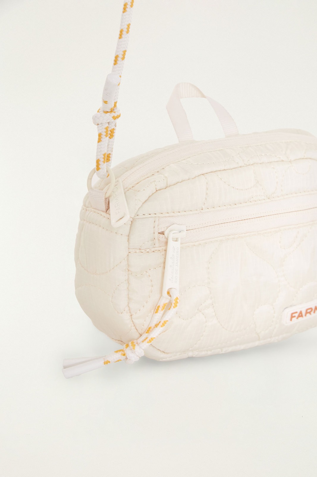 Bolsinha com abertura principal e bolso frontal com fechos de zíper. acompanha alça de corda ajustável, para usar a bolsa transversal ou como baguete. na parte de trás da bolsa também se encontra dois passadores que possibilitam o uso como pochete presa em cinto.